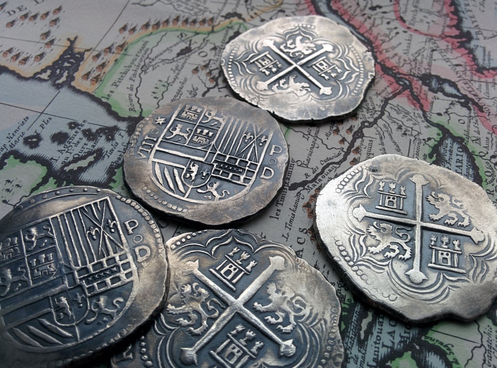 The most iconic coins of sunken Spanish galleons, buried beneath white shell sands and a Caribbean blue sea.