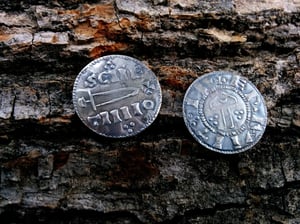 These pennies were struck around AD 919-921 in Viking York. prominently bearing Thor's hammer on one side and a sword on the other. Around the sword, and very stylized, the legend reads 'SCI PETRI MO' (St. Peter's Money). The hammer side reads '+ERIVIITOII' (Eboraci Civitas - City of York).